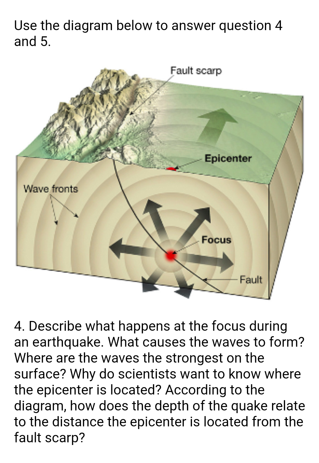 Diagram of an earthquake. Measuring the Diameter of the Earth's Core with Seismic Waves... A diagram of a cross-section of the Earth shows how the epicenter of an earthquake, the earthquakes S-shadow and the center of the inner core can be used to estimate the radius of the Earth's core. A triangle is drawn from the three points so the radius of the Earth is equal to the length... Seismic phases and earthquake location - ppt video online download 38 Wadati diagram for checking readings An example of a Wadati diagram. The intercept on the x-axis gives the origin time. 42 Depth of local eartquake Local earthquakes: several stations within 2 times depth is required to get an accurate depth. Using Pg and Pn together also restricts the depth. Earthquake Size Early estimates of earthquake size were based on non-instrumental measures of the earthquakes effects. For example, we could use values In 1935 Charles Richter constructed a similar diagram of peak ground motion versus distance and used it to create the first earthquake magnitude scale (a... Anatomy of an Earthquake | Exploring Earthquakes Earth's crust is broken up into irregular pieces called tectonic plates . These large pieces of crust were formed by the combination of gravity and rising heat from There are different types of seismic waves, each one traveling at varying speeds and motions. It's these waves that you feel during an earthquake.