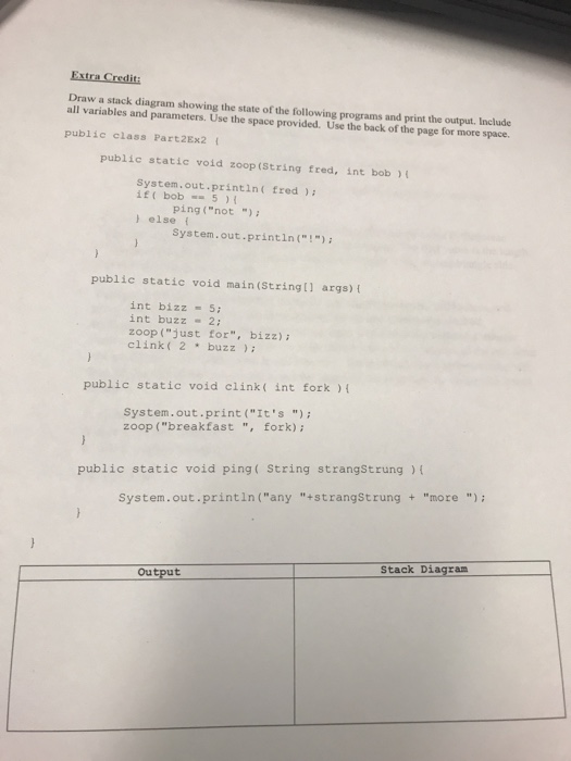 Solved Draw a stack diagram to show the state of memory ... Draw a stack diagram to show the state of memory just before println is called. Assume the user inputs the value 10. public static void show(double c)