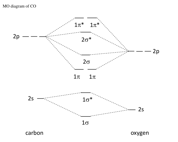 Draw MO diagram of CO and calculate its bond ... - Shaalaa Molecular orbital diagram of Carbon monoxide molecule (CO) Electronic configuration of C atom: 1s 2 2s 2 2p 2. Electronic configuration of O atom: 1s 2 2s 2 2p 4. Electronic configuration of CO molecule : σ 1s2, σ 1s*2, σ 2s2, σ 2s*2, π 2py2, π 2pz2 σ 2px2. Bond order = N b N a N b - N a 2. = 10 - 4 2 = 3.